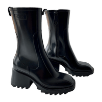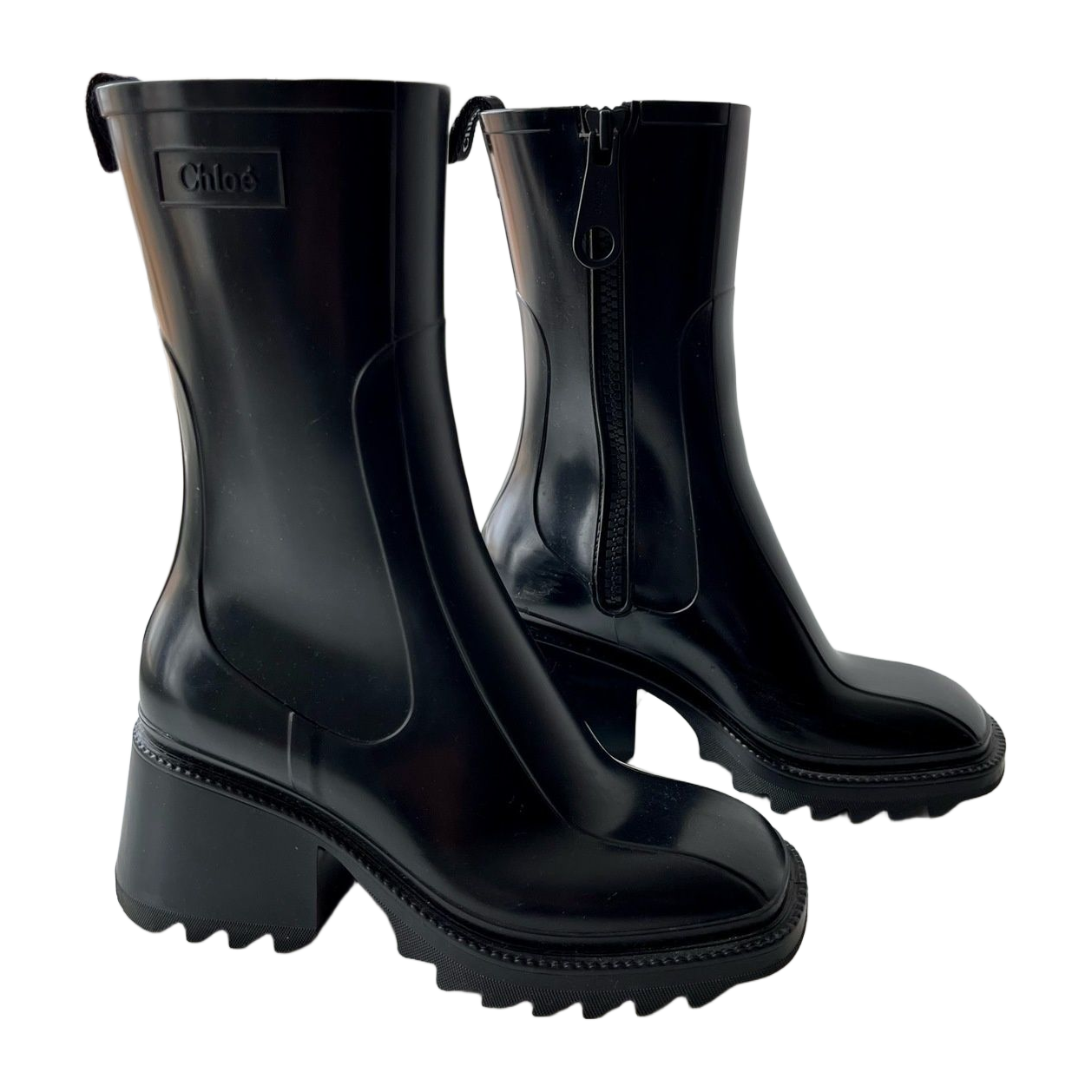 Mustat Chloé Betty rain boots. Koko 36. Kauniit ja naiselliset kumisaappaat hyvässä käytetyssä kunnossa. Paksu 7cm korko, mukavat jalassa. Vetoketjut sisäsivuissa. Käytetty pohjallisen kanssa joten sisältä erittäin siistit.