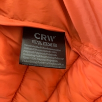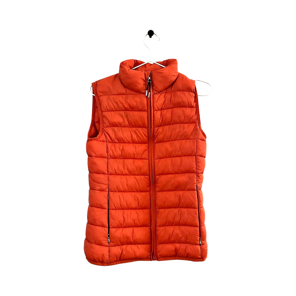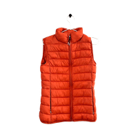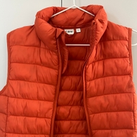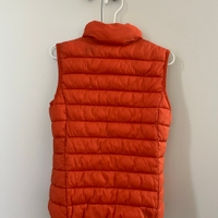 Oranssi kevyttoppaliivi, koko XS. Pari lankaa sojottaa, mutta muuten hyvässä kunnossa. Täyte 100% polyesteriä.