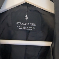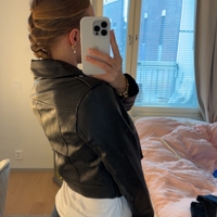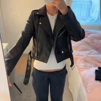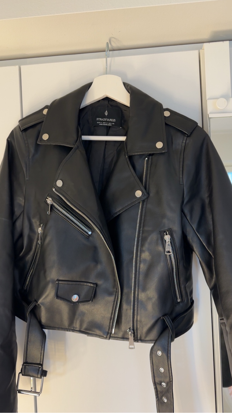 Lyhyt musta biker-mallinen keinonahkatakki, vetoketjut ja vyö.
