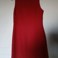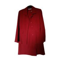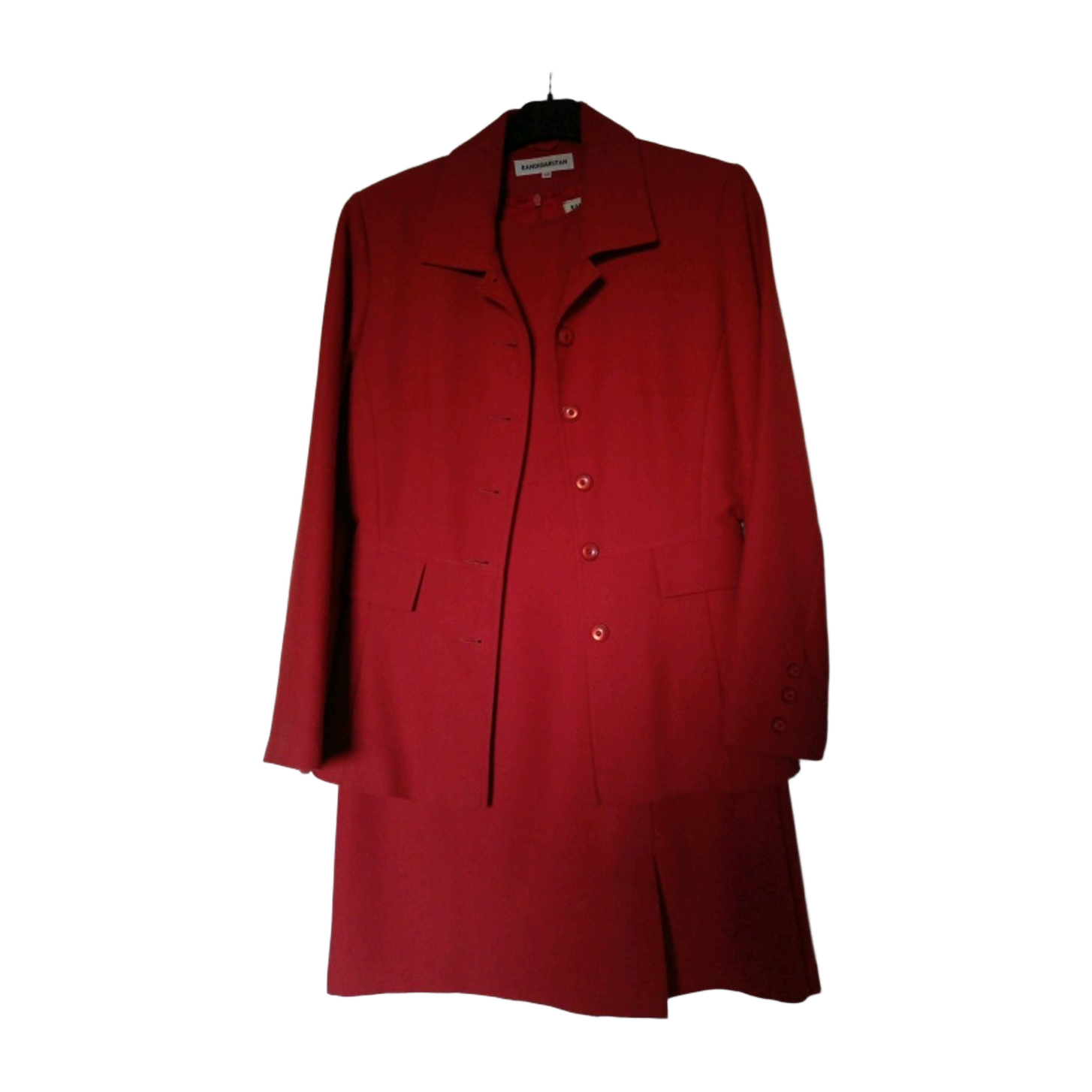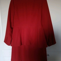 Oranssi puku, mekko ja takki. Ovat luonnossa tummempia kuin kuvassa, ei punaisia. Mekon vyötärön ympärys 78 cm, olka-helma 90 cm, vuoritettu. Pieni halkio edessä vasemmalla. Made in England.