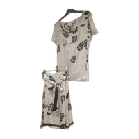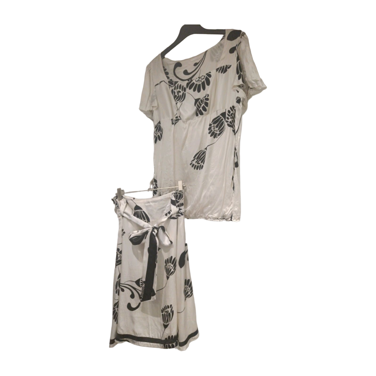 Silkkinen pusero ja hame. Hameeseen kuuluu vyö. Koko M. Vyötärö 80 cm.