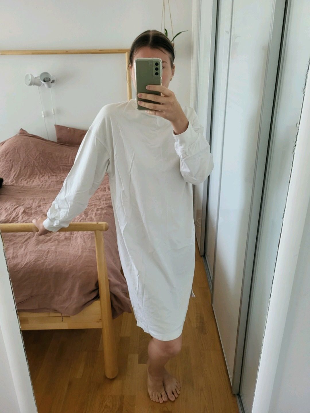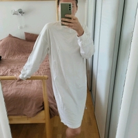 Valkoinen puuvillamekko. Joitain tahroja siellä täällä, joita en ole yrittänyt poistaa. Voivat hyvinkin tahranpoistolla lähteä 🤍