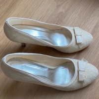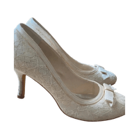 Ivory lace mid-heel pumps with bow detail, elegant wedding shoes.
