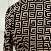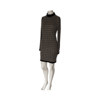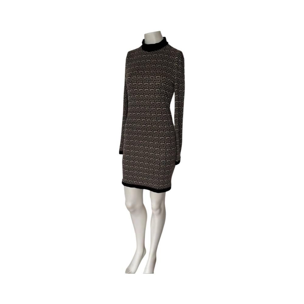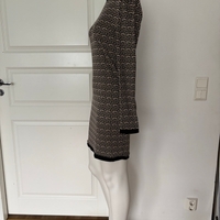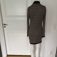 Pitkähihaista slim-fit neulemekkoa, geometrinen kuvio, korkea kaulus. Joustava hyväkuntoinen beige/musta. Selässä vetoketju . Helppohoitoinen joustava materiaali pese ja pidä. Kai-kai 44 mutta joustaa 46. Olka-helma 63 myynnissä myös muualla