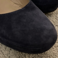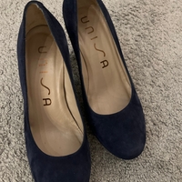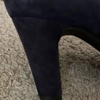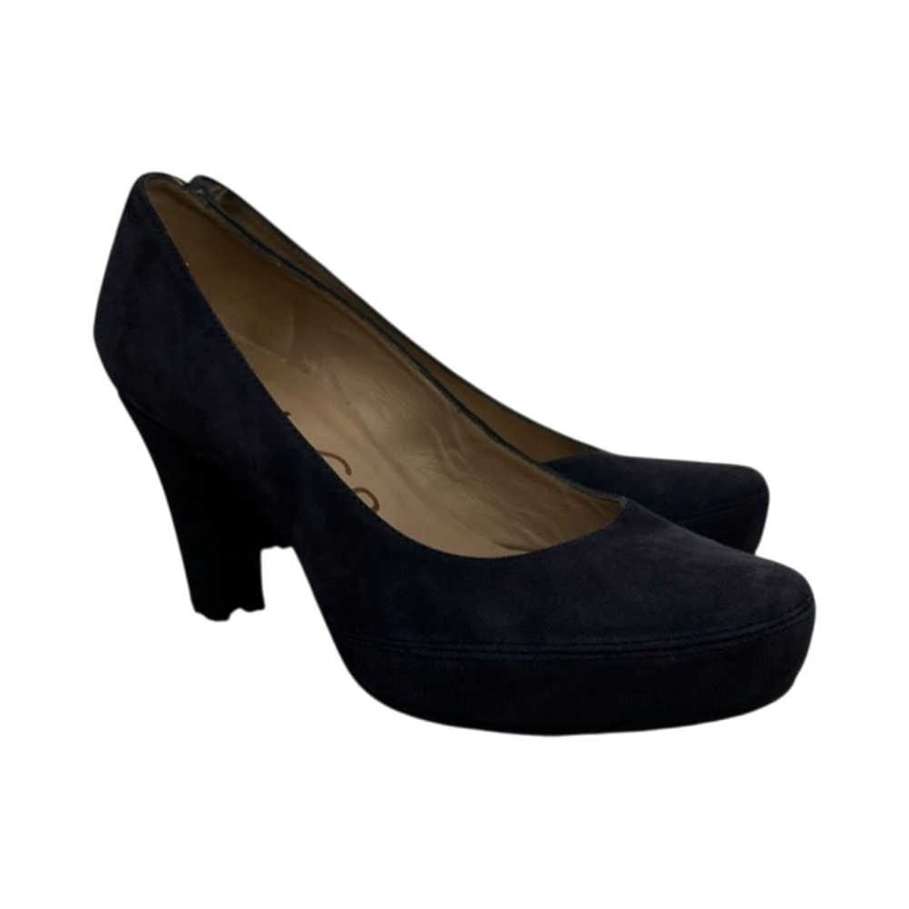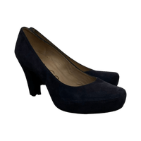 Classic navy suede block-heel pumps, slightly worn.