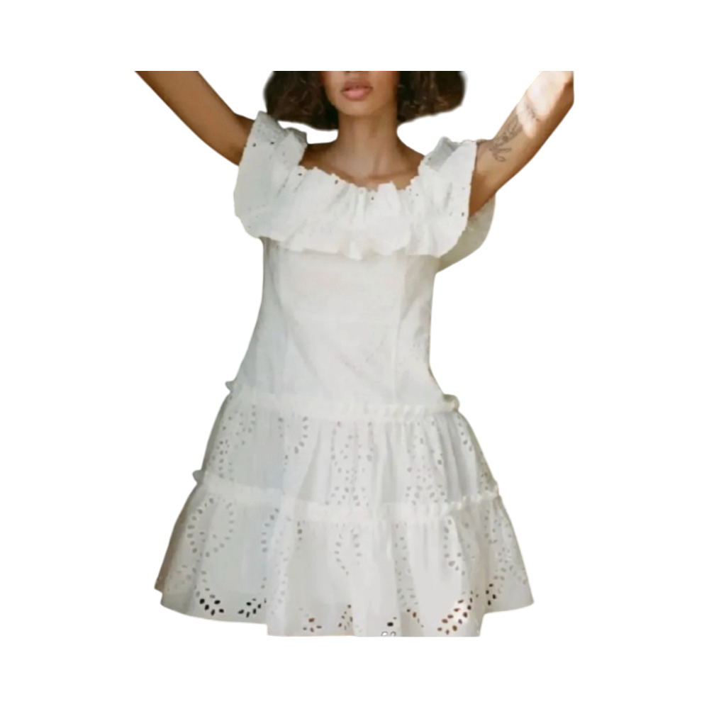 Lyhyt off-shoulder mekko kirjailtuilla kuvioilla.