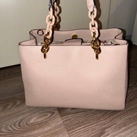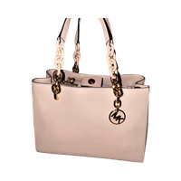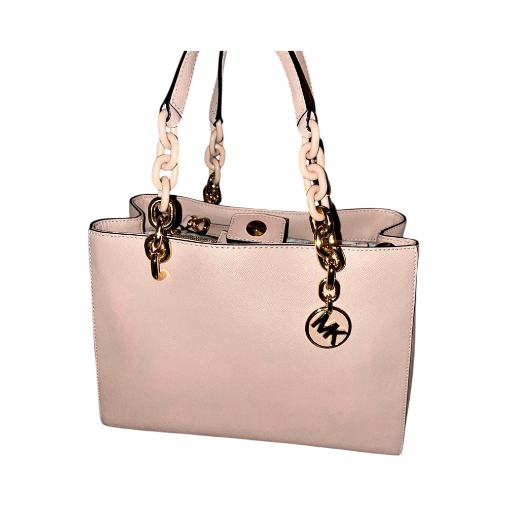 Cynthia medium satchel. Soft pink eli vaaleanpunainen väri. Laukussa on kultaiset metalliosat ja ketjulliset olkahihnat. Sisätiloissa on vetoketjutasku ja sivutaskuja. Materiaali saffiano nahka. Ostettu michaelkors.eusta 2020.