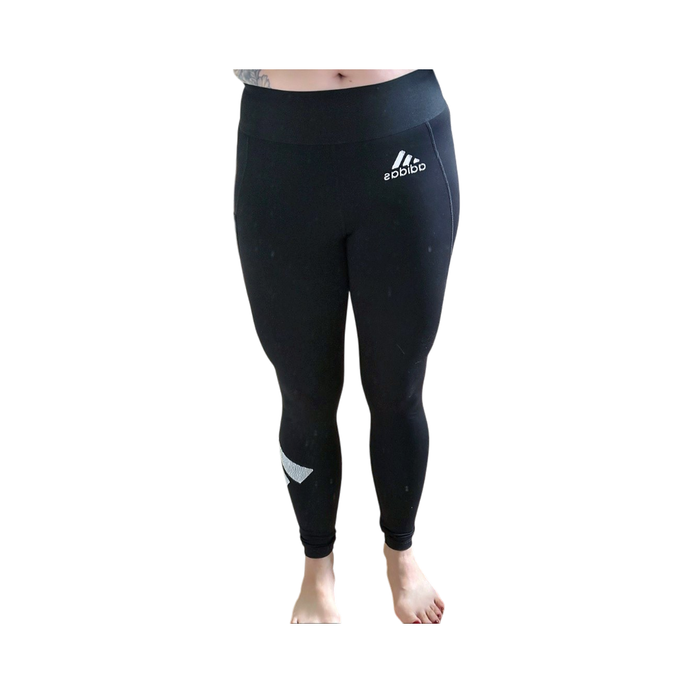 Korkeavyötäröiset treenileggingsit kännykkätaskulla, verkko-matskua pohkeiden kohdalla, näkyvää kulumaa vyötäröllä, printit myös kärsineet, muuten upeat treenihousut, itselle pienet