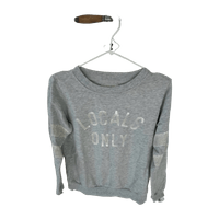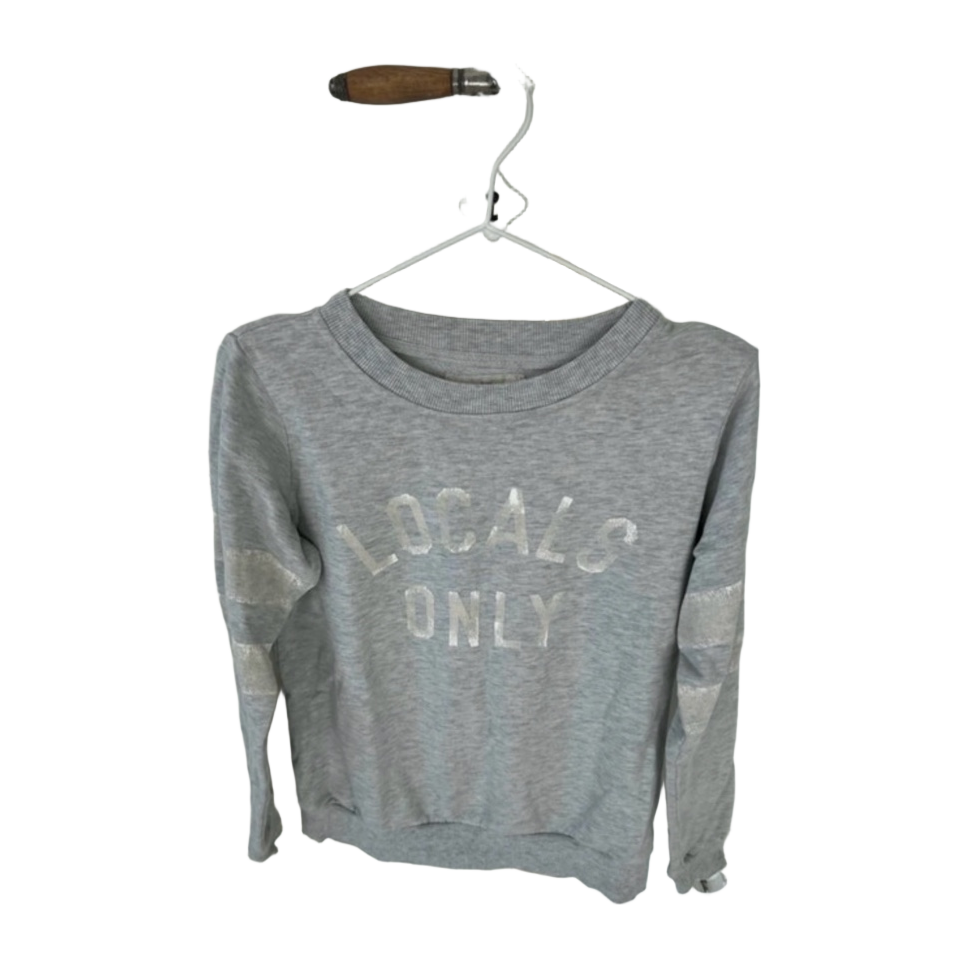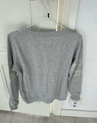 Vaaleanharmaa / harmaa collegepaita koossa XS. Edessä ja hihoissa valkoisia yksityiskohtia.