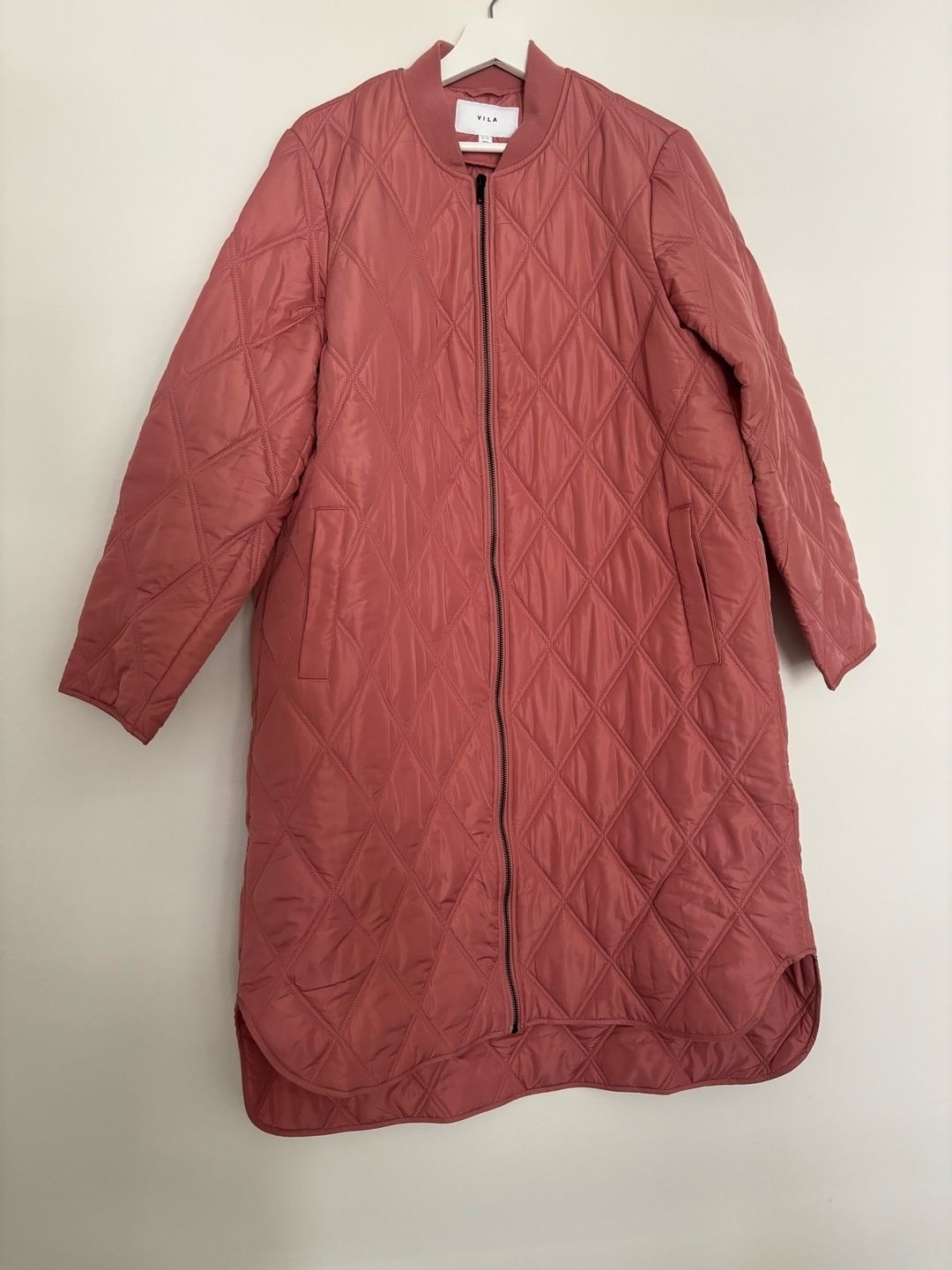 Vaaleanpunainen tikattu takki, jossa edessä on vetoketjukiinnitys. Takissa on etutaskut. Pituudeltaan takki on noin polvipituinen, mutta takaosa on hieman pidempi. Vain pari kertaa ollut päällä.