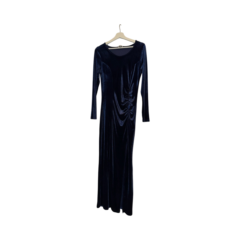 Pitkä tumman sininen samettimekko, rypytys sivulla, pitkät hihat.