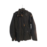 Lightweight black hooded Icepeak jacket with zip and mesh lining. Slight damage in sleeves, fixed with hand stitching. Some Pilling in the inner lining.