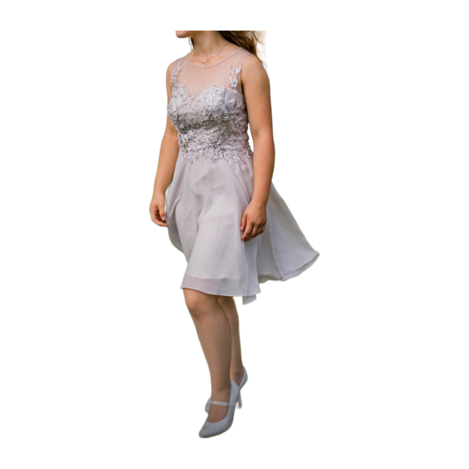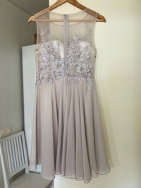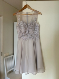 Beige juhlamekko helmikoristeilla ja pitsiyksityiskohdilla. Myynnissä kerran käytetty hyväkuntoinen rippimekko. Koko 36, vastaa mielestäni kokoa. Haloselta ostettu, Laona -merkkinen.