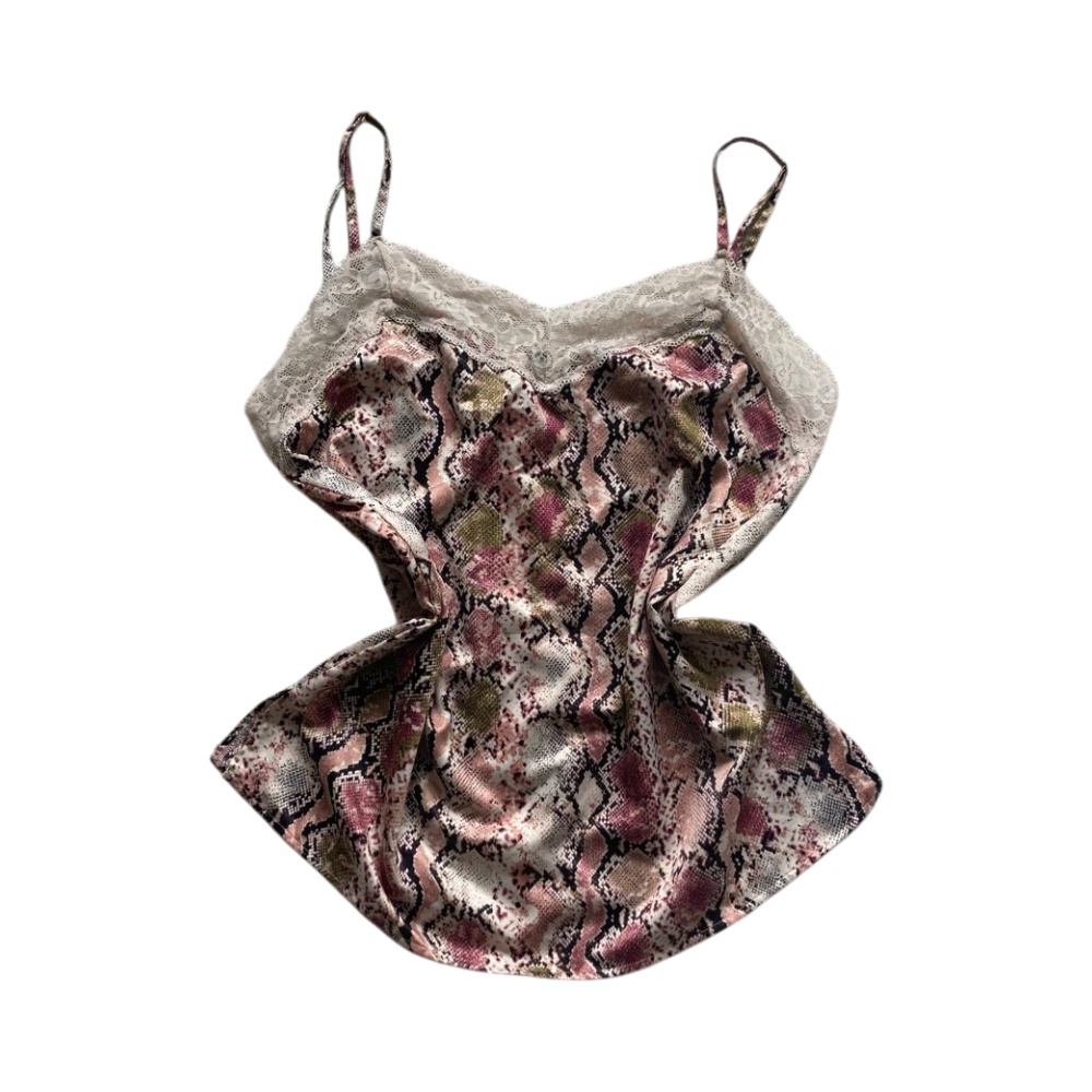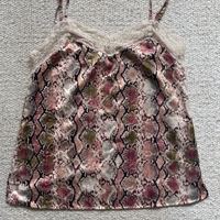 Pinkki beige käärmekuvioinen pitsireunainen toppi. Hyväkuntoinen ja vähän käytetty.