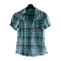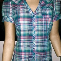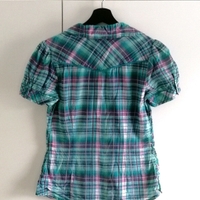 Puuvillainen (100%), tiukan imartelevasti kropalle istuva lyhythihainen paitapusero. Hihoissa aavistus puhvimaisuutta. Turkoosia ja vaaleanpunaista väreissä. Koko vastaa XS/S-kokoa.