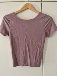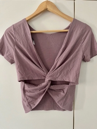 Hollisterin toppi jossa takana ”solmu”. Voi vaikka käyttää myös toisinpäin eli solmu eteen. Koko M mutta menee hyvin myös S kokoiselle. Uusi ei koskaan käytetty