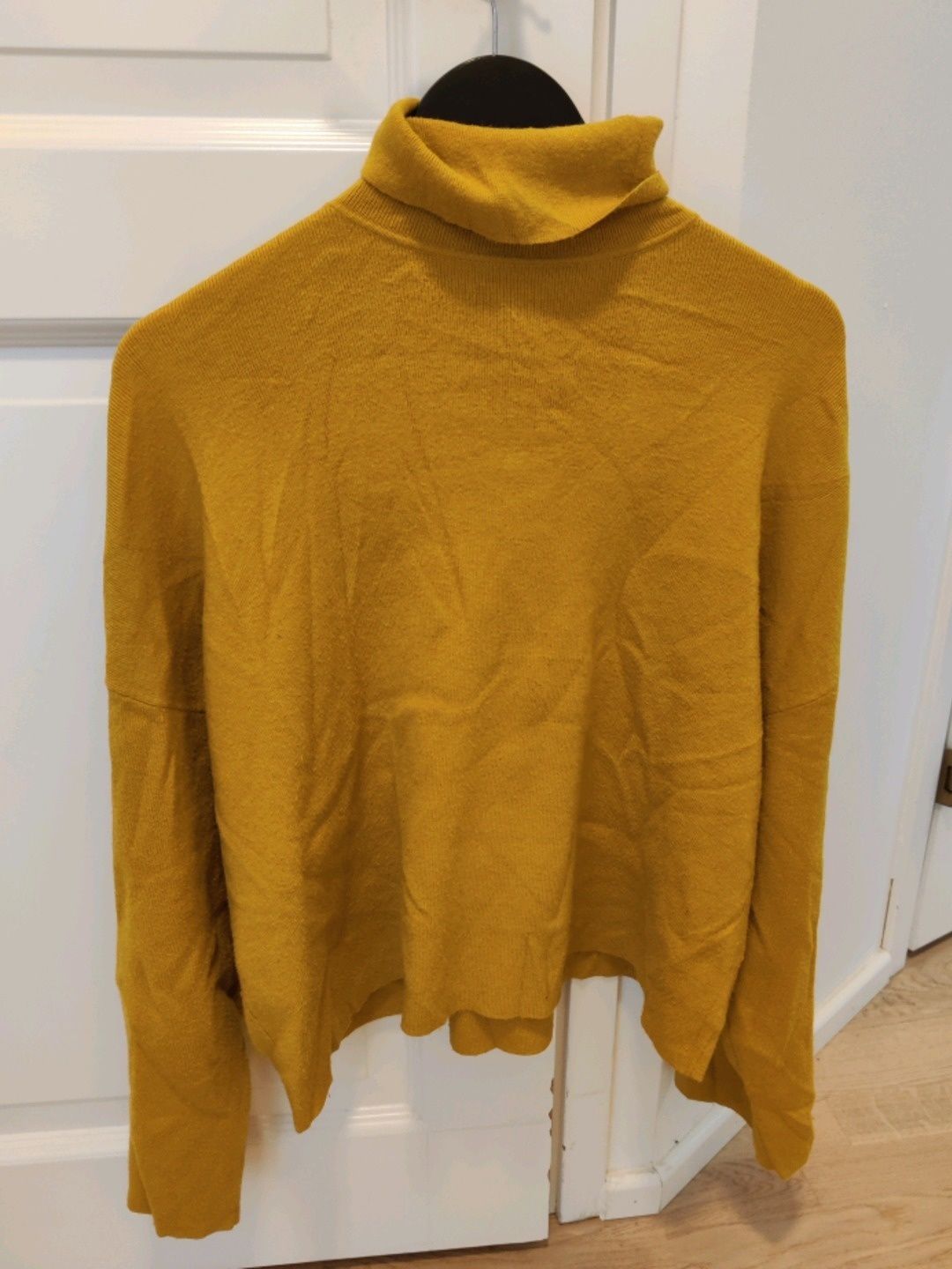 Keltainen rento neule. Ryppyyntynyt kaapissa, kestää silityksen.