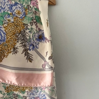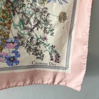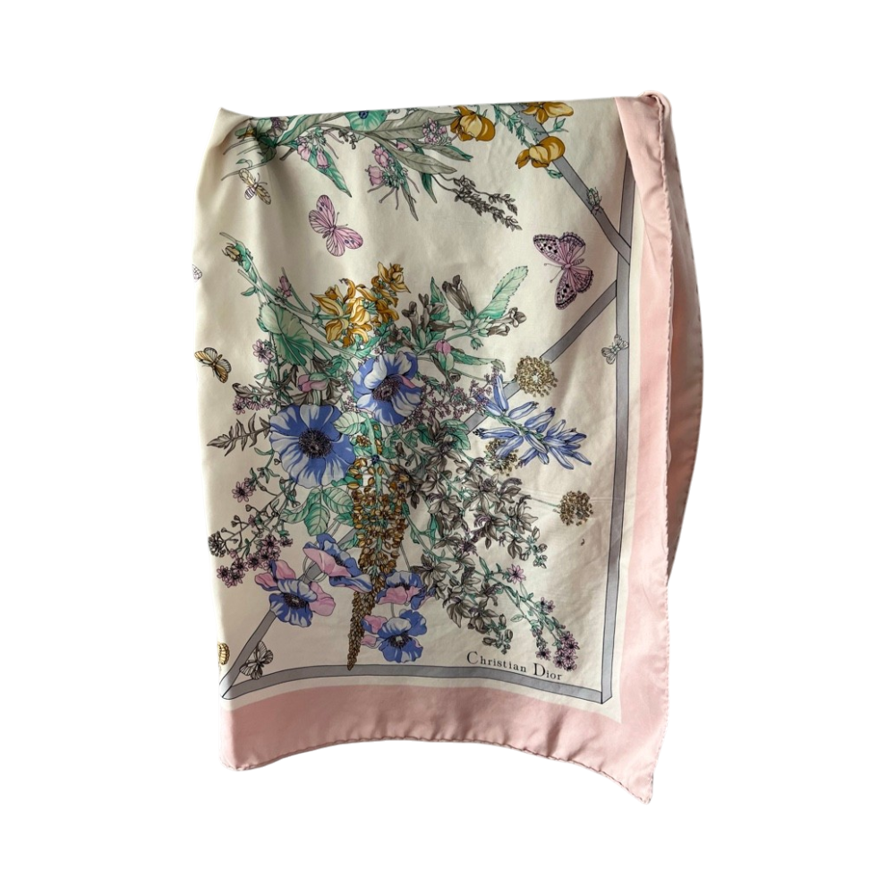 Upeasti kuvioitu hempeä silkkihuivi, Vintage Dior. Hyvässä kunnossa. Koko noin 85x90cm.