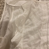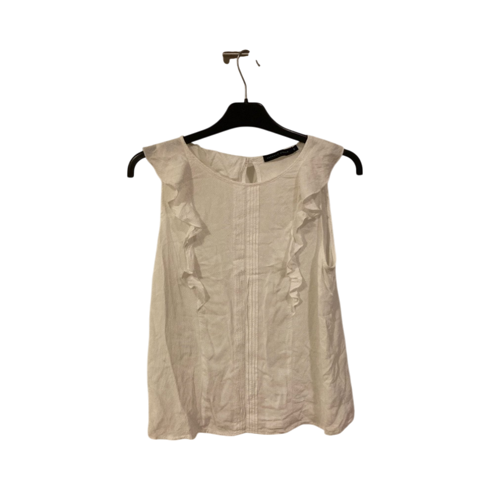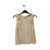 Hihaton valkoinen toppi röyhelöillä, kevyt tekstuuri.