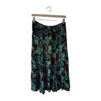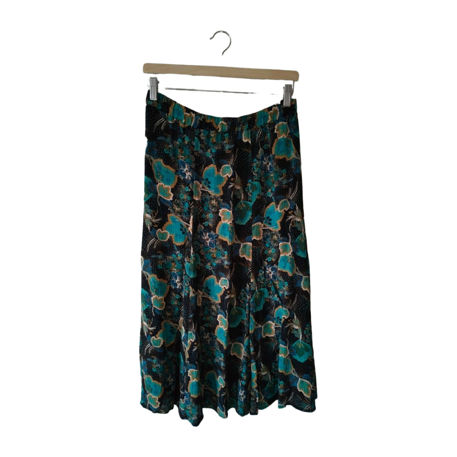 Kotimainen vintagehame upealla kuosilla. Koko sanoo 36, mutta vyötärönauha on varmaan löystynyt eli siitä ei vastaa tuota kokoa. Vyötärö tasomitta n. 38cm. Hameessa on vuori.