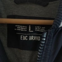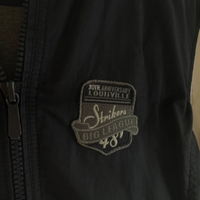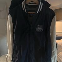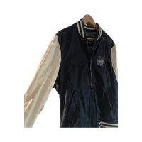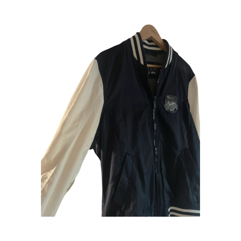 Two-tone varsity jacket with front zipper and embroidered patch.
