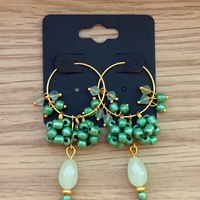 Vihertävät sirot korvakorut helmipalloilla. Kultainen rengas, jonka halkaisija 2,5cm.