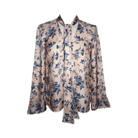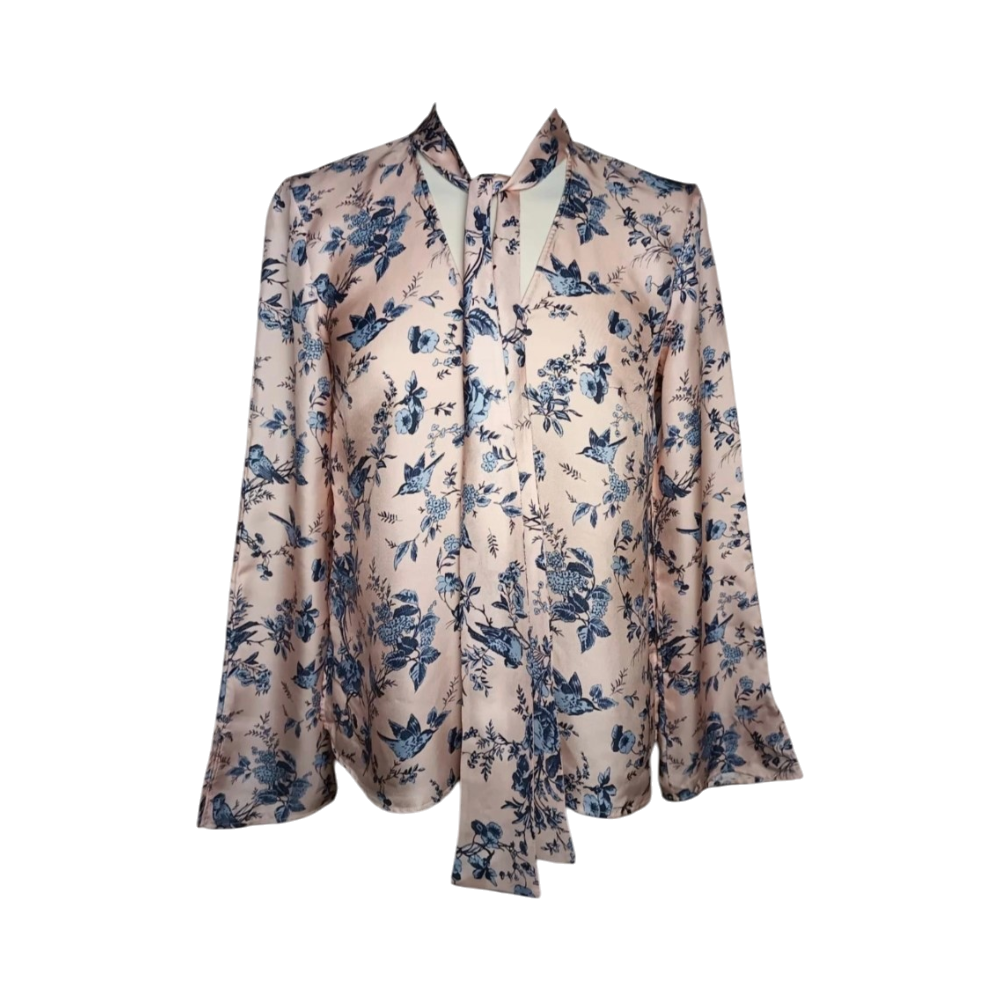 Elegant and timeless Max&Co blouse made from 100% pure silk. The soft blush pink fabric features a delicate blue floral print, giving it a romantic and refined look. Designed with a tie-neck detail and flowy long sleeves, it drapes beautifully and feels luxurious on the skin. Perfect for both office wear and special occasions.