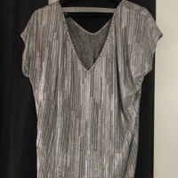 Hopeanvärinen, lyhythihainen pusero, v-kaula-aukolla, selkäpuolella syvempi leikkaus. Ulkomailta ostettu, ei merkkiä, oversize M tai L