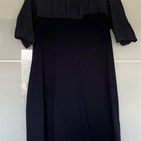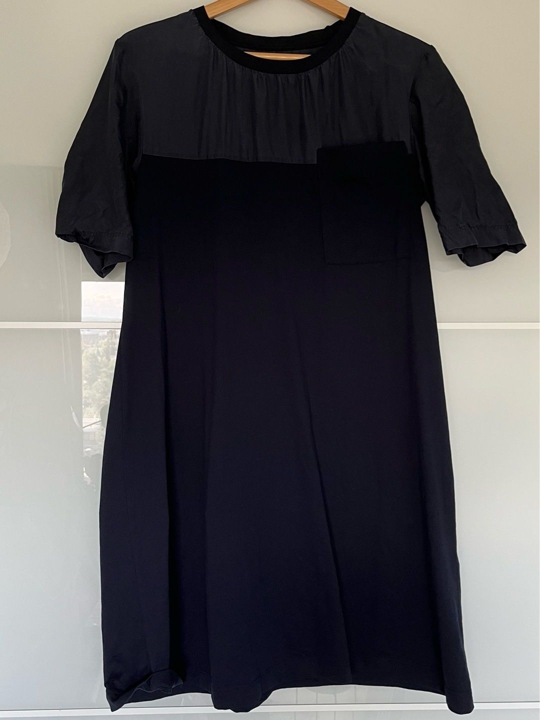 COSin tummansininen trikoo/silkki mekko. Yläosan silkki kuultaa kauniisti läpi. Rento A-linjainen leikkaus, tyylikäs väri.