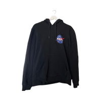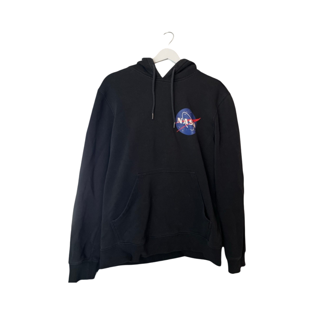 Musta huppari suurella NASA-logolla, etu- ja takaprintti.
