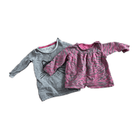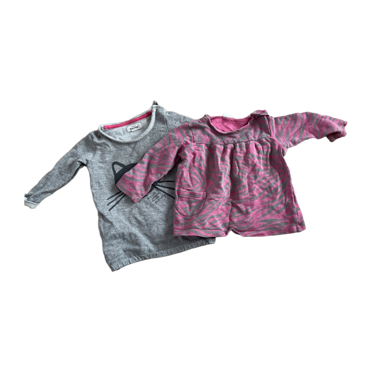 Kaksi tunikamallista paitaa, hieman paksumpaa kangasta. Sopivat n. 74-80-kokoiselle.
