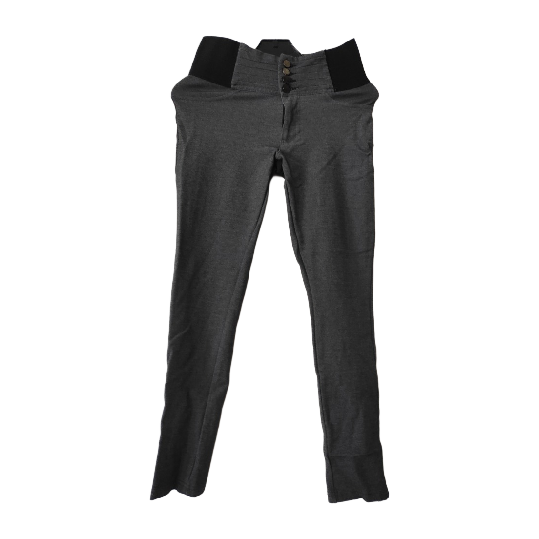 Joustavat suorat housut, joissa korkeavyötärö. Vyötäröllä kuminauha ja napitus, sekä vetoketju. Haaramitta 60cm