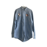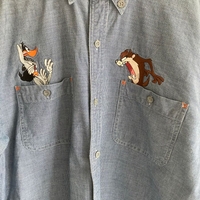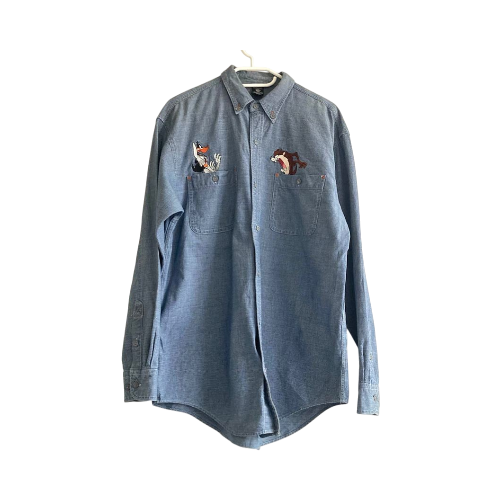 Keywords: Looney Tunes, Warner Bros, vintage shirt, embroidered cartoon shirt, Daffy Duck, Taz, retro, 90s aesthetic, oversized, loose fit, unisex, graphic shirt, collectible, novelty shirt, streetwear, pop culture, fun shirt, character embroidery, denim look shirt, rare vintage