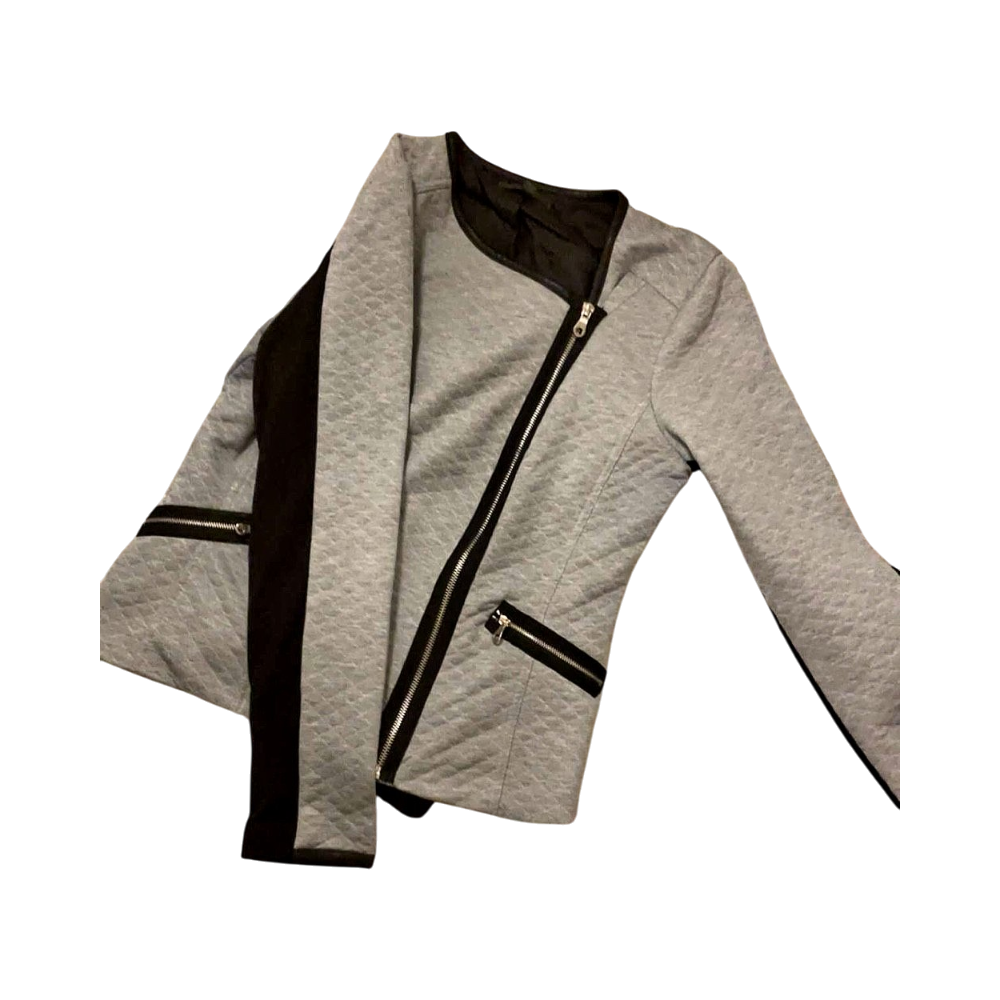 Tyylikäs harmaa takki mustilla yksityiskohdilla.