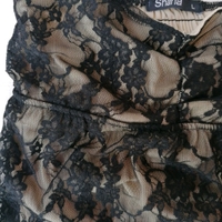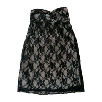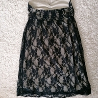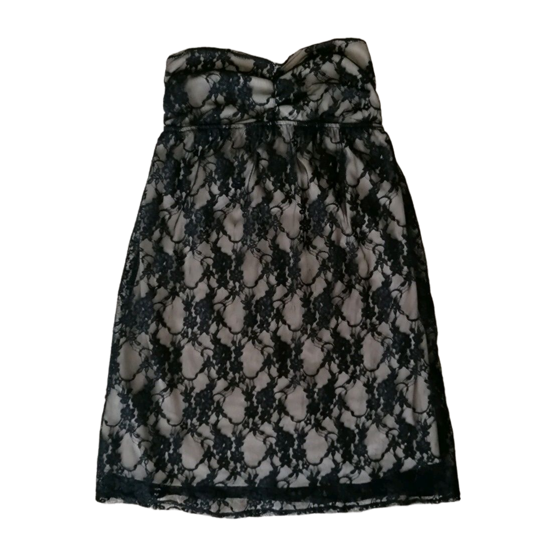 Olkaimeton minimekko. Musta pitsi ja beige alusmekko. Kokolapussa lukee L, mutta pientä kokoa, joten arvioisin XS/S. Kapein kohta rinnan alta venyttämättä n. 32 cm. Mekon pituus rinnan keskikohdasta alas mitattuna n. 66 cm.