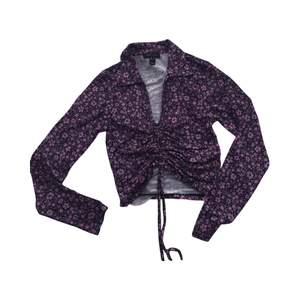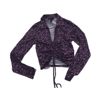 Pitkähihaisen ruutukuvioinen pusero, nauharypytys edessä.