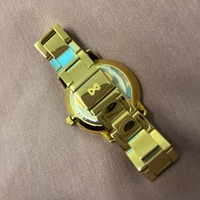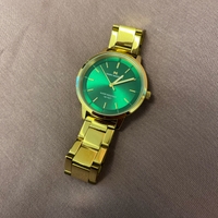 Naisten kultainen rannekello vihreällä kellotaululla.