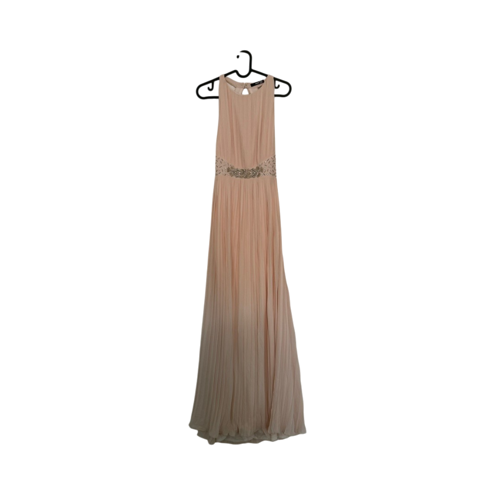 Vaaleabeige pitkä pliseerattu juhlamekko helmikoristelulla.