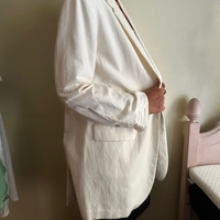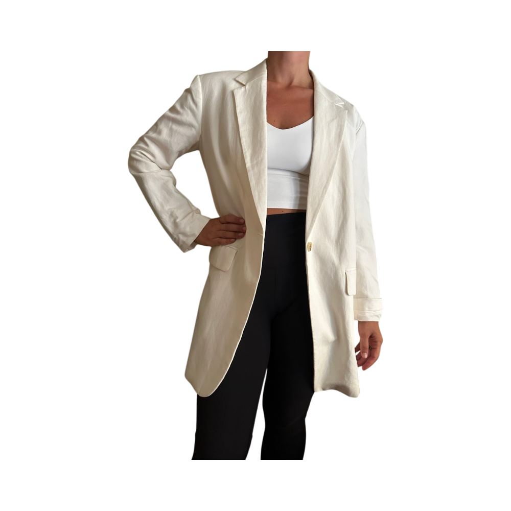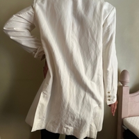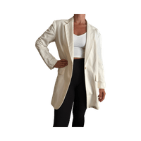 Oversize-valkoinen bleiseri, yksirivinen, taskuilla, pitkä malli.