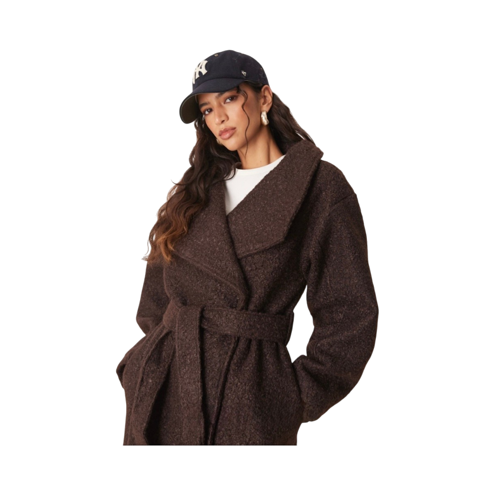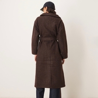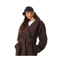 Pitkä villakangastyylinen takki vyöllä, lämmin ja tyylikäs.
