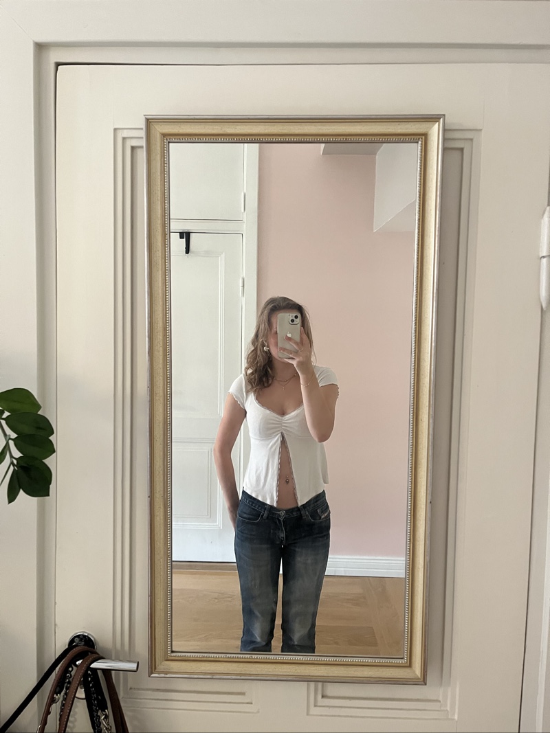 Short-sleeve fitted top with ruffle hem, casual everyday style.