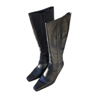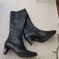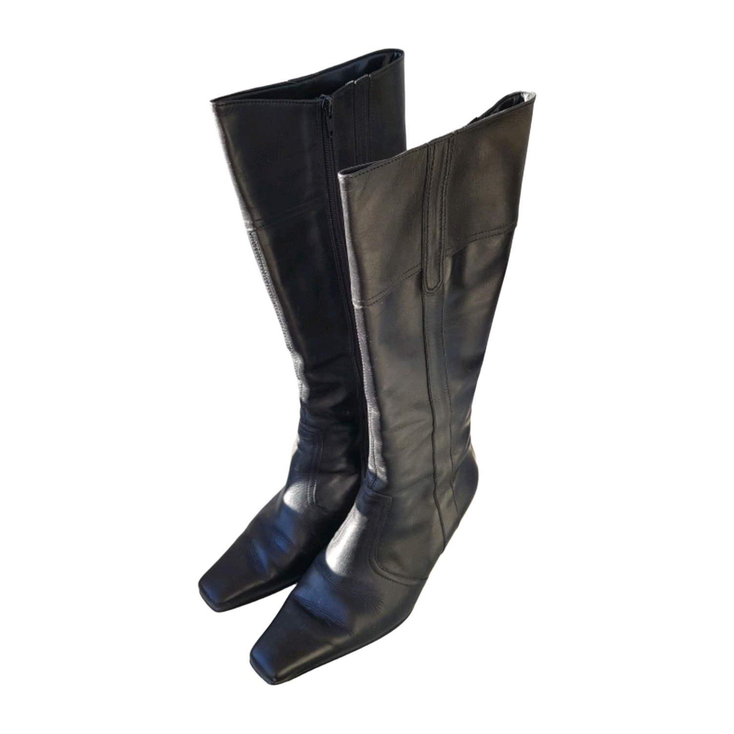 Mustat nahkaiset saappaat koko 4,4 /37,5. Pohkeen istuvuutta parantaa kuminauhavenyke.