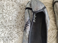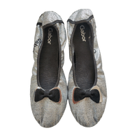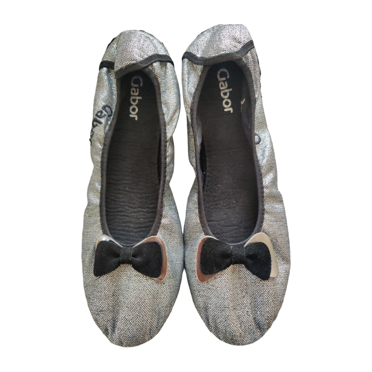Hopeiset Gabor- ballerinat, joissa musta rusetti. En ole käyttänyr, koska liian pienet. Itselläni koko 41 ja nämä 42, mutta pienet. Pituus 27,5 cm. Koodilla MN2831 ilmainen toimitus.