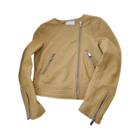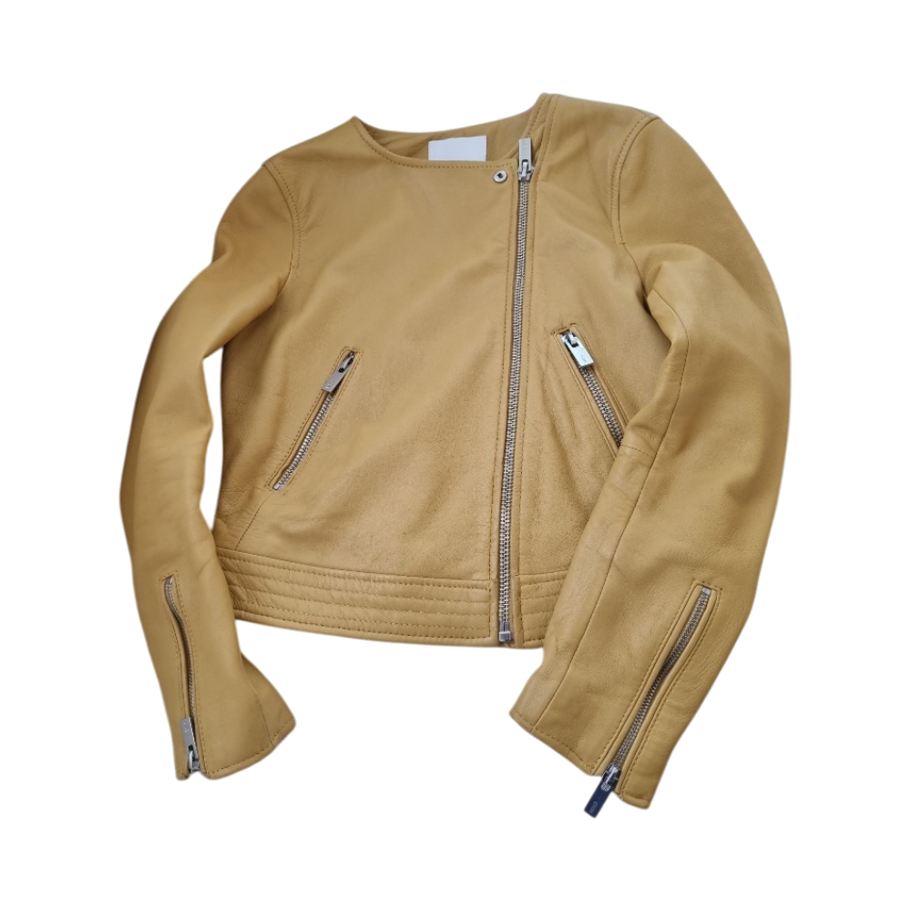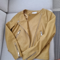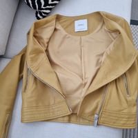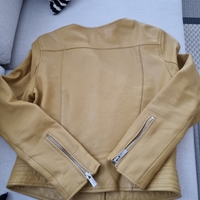 Lyhyt naisten nahkatakki, vetoketjuyksityiskohdilla. Kaunis keltainen, todella vähän pidetty. Hopeanväriset vetskarit.