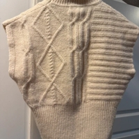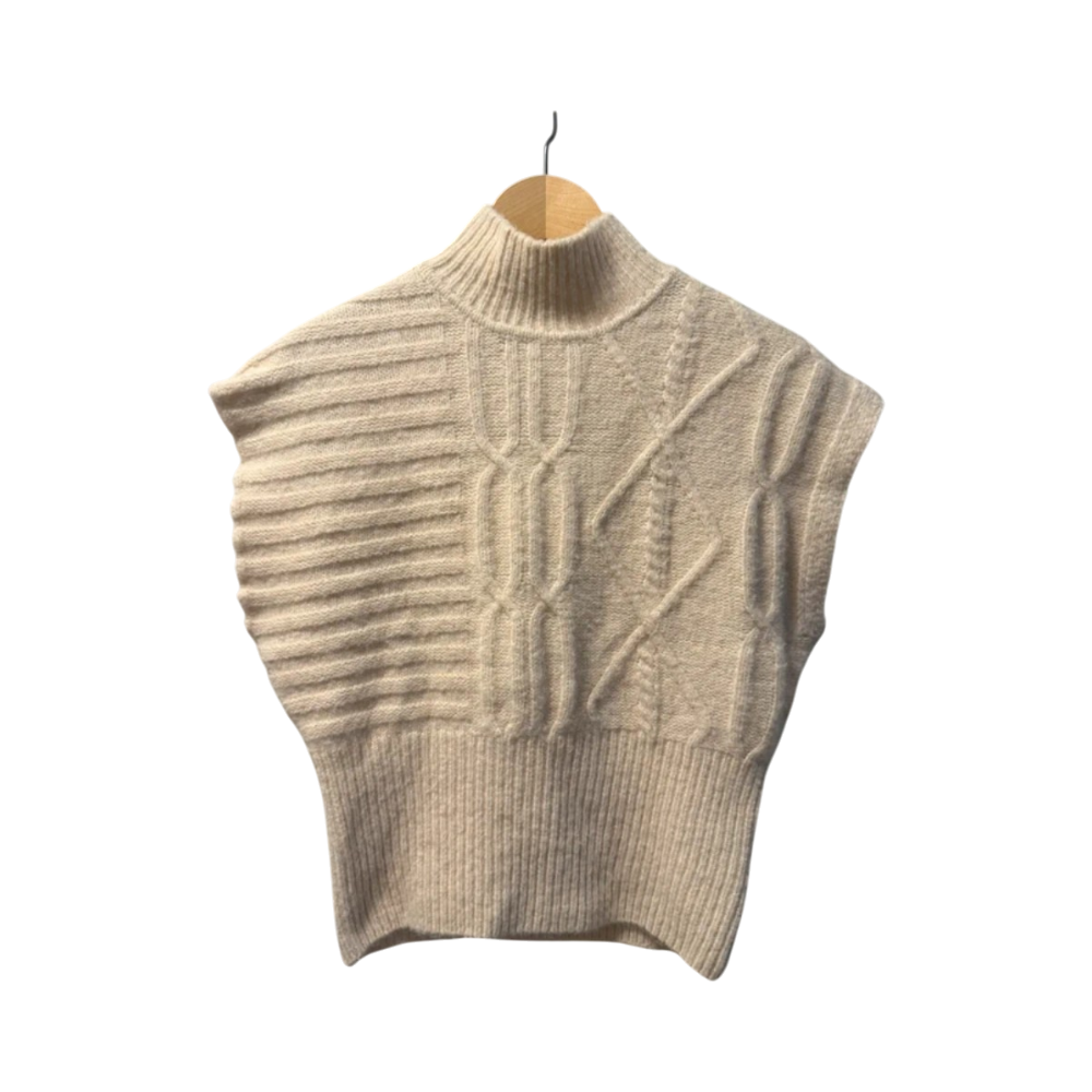 Beige cable-knit sleeveless sweater, high neck, cozy soft texture.