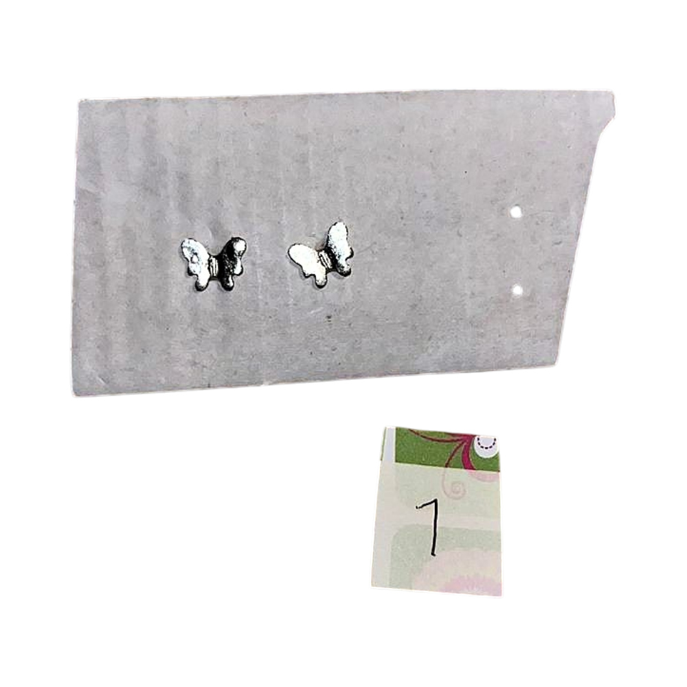 Hopean väriset perhos korvakorut. Puhdistettu ja desinfioitu käytön jälkeen. Eläintalous MMM, lisätietoja saa kysymällä