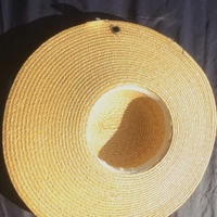 80-/90-luvulta äidilleni kuulunut leveälierinen olkihattu, jossa keskisininen rusetille solmittu koristenauha ja lierin sivuilla reiät, joihin voi halutessaan pujottaa omat nauhat leuan alta solmimista varten. Ei koko-, merkki tai materiaalilappuja. Sisäpuolella valkoinen hikinauha. Reunassa takavasemmalla vain pieni ompeleen purkauma. Lierin leveys kuvun reunasta n. 14 cm. Kuvun korkeus lieristä n. 7 cm. Ympärysmitta sisäpuolelta ~54 - 55 cm 🚭, ei lemmikkejä. #vintage #80s #90s #straw #hat