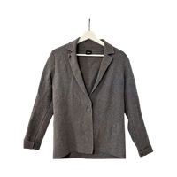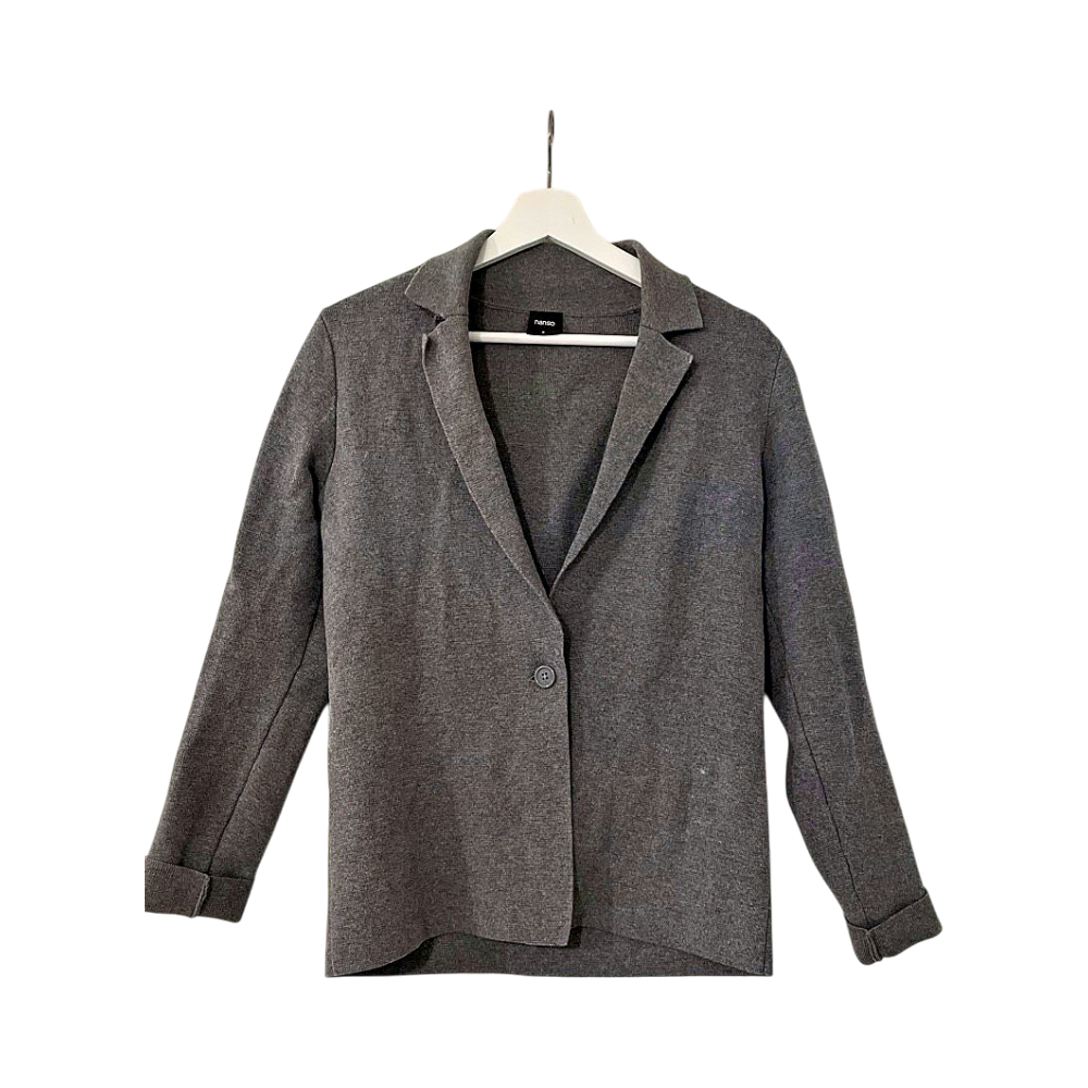 Soft grey knitted single-button blazer, casual tailored fit.