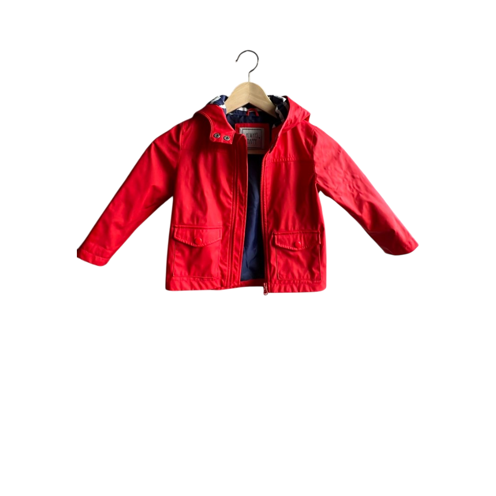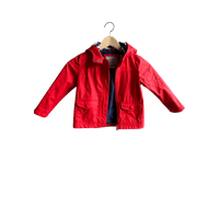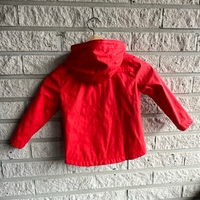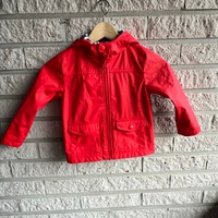 Lasten punainen hupparillinen sadeparkatakki, vetoketju ja taskut.