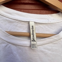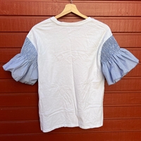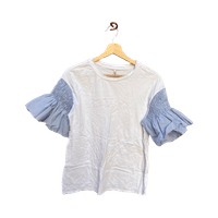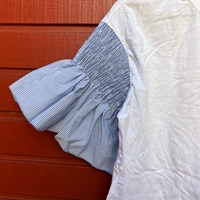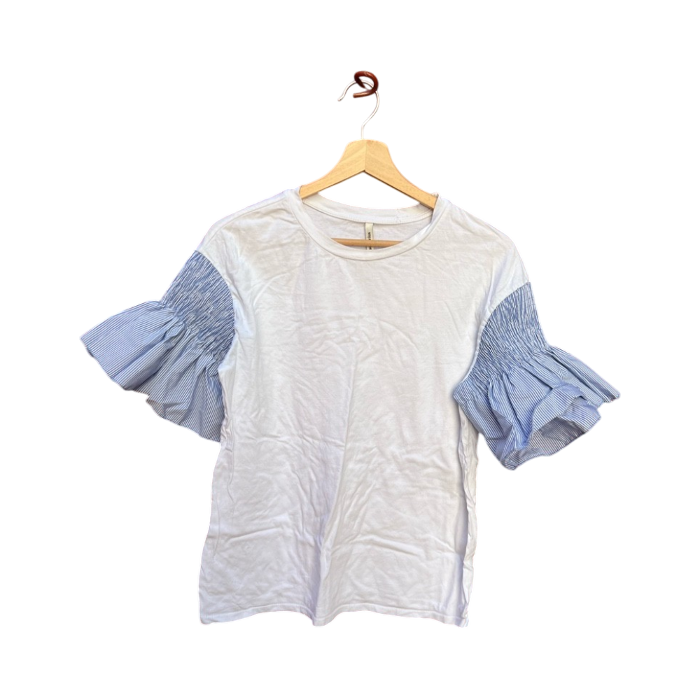 Valkoinen t‑paita sinisillä röyhelöhihansuilla, hyväkuntoinen. Koko L